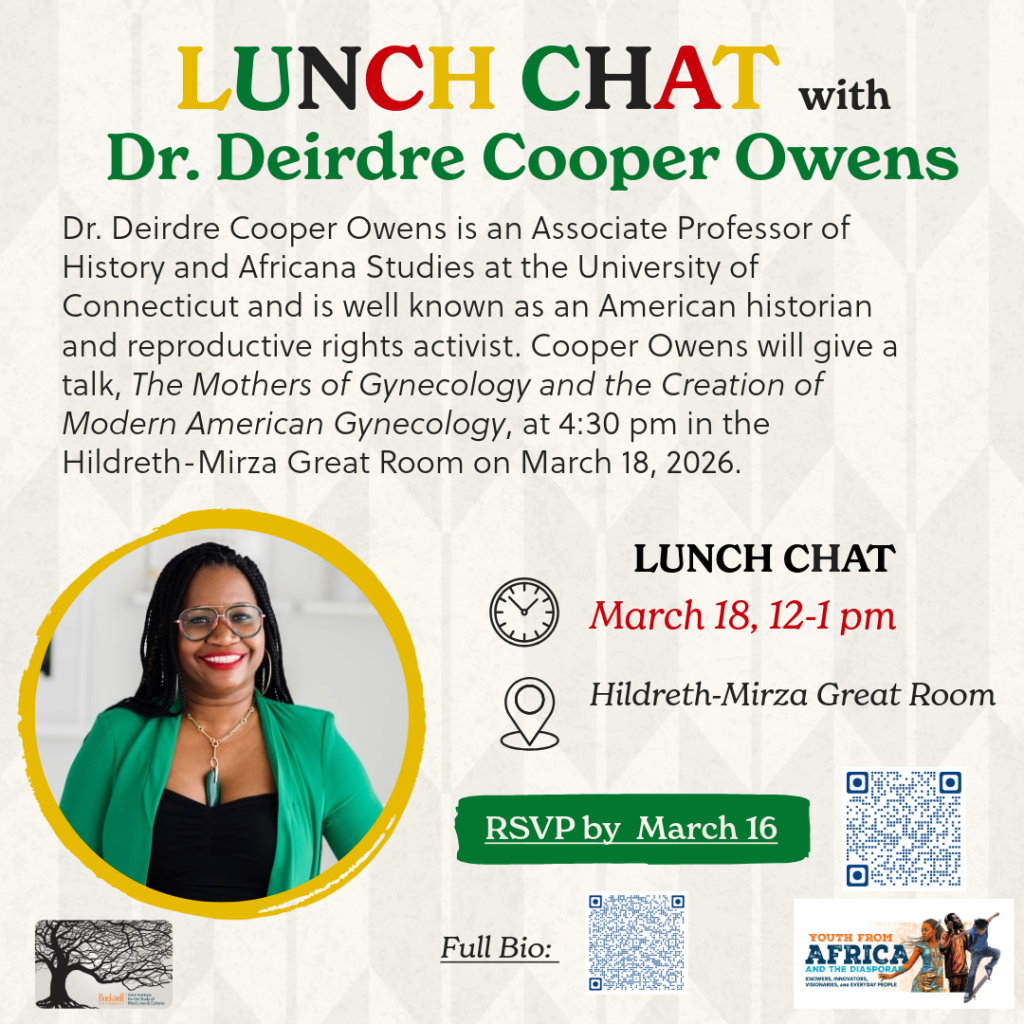 We will have a month hiatus from programming until the Griot interns present their research findings on April 28th after a full year of inquiry. Please join us for this special presentation in the Great Room from 11:30-1:00. We will additionally celebrate the five graduating seniors, Debra Gonkpah, Da’Mirah Vinson, Jean Marie Ngabonziza, Holiness Kerandi, and Grace Ifiegbu.